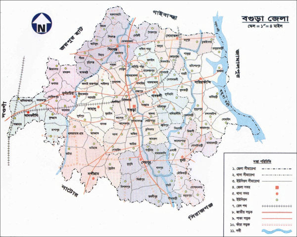 সীমানা : উত্তরে গাইবান্ধা ও জয়পুরহাট জেলা, দক্ষিণে নাটোর ও সিরাজগঞ্জ জেলা, পূর্বে জামালপুর ও সিরাজগঞ্জ জেলা এবং পশ্চিমে জয়পুরহাট ও নওগাঁ জেলা।